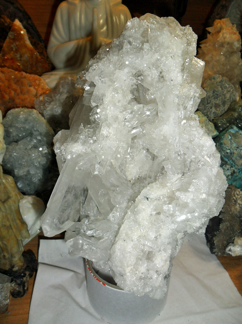 Exceptionally Very Gorgeous Huge Quartz Crystal Cluster. There are also some small but well-formed and sharp gemmy colorless quartz crystals. There are also numerous galena crystals that are a gray color with a metallic luster. Inclusions of other minerals in rock crystal and smoky quartz are not particularly uncommon and are often highly attractive. They may be of two general types: early formed minerals that were captured by later formed quartz as it grew and minerals that were forming in or floating in the hydrothermal fluids that were deposited on the growing quartz crystal. Crystal Quartz promotes determination, self-control, and strength of will. It is associated with happiness and communication with spirit guardians and general healing. It is one of the most powerful crystals there is. It is very energetic. It is natural however; it looks polished because it is so clear. It is believed that these crystals exhibit the closest manifestation of pure white light that can be witnessed on the physical plane. Crystals are used during meditation to escort us into the realism of the pure white light and can bring depth and clarity to dreams, help manifest wishes, and overcome negativity to be able to love life in the present moment. These rainbow crystals bring rainbows into one's life and are a very special gift from the spirit-keeper of the crystal; they help one to deal with negativity and to maintain the constant awareness that love is within the life one experiences at every moment. It's a Beautiful thing how Mother Earth Creates such a Beautiful Creation and takes Millions of years to Create. This Crystal is as Perfect with Perfection. This Beautiful Crystal Cluster been in My Gallery Collection over 30 years. Origin: Brazil. This Beautiful Crystal Cluster Measurements: 7 1/2"Tall 6"Wide and 5" Thick. Weighs: 6.40 lbs. Exceptional Price: $395.00 Shipping and Handling $35.00 Pictures show all Angles of this Beautiful Crystal Cluster. Exceptional Luster and Just Breath Taking. More Pictures on Request. |