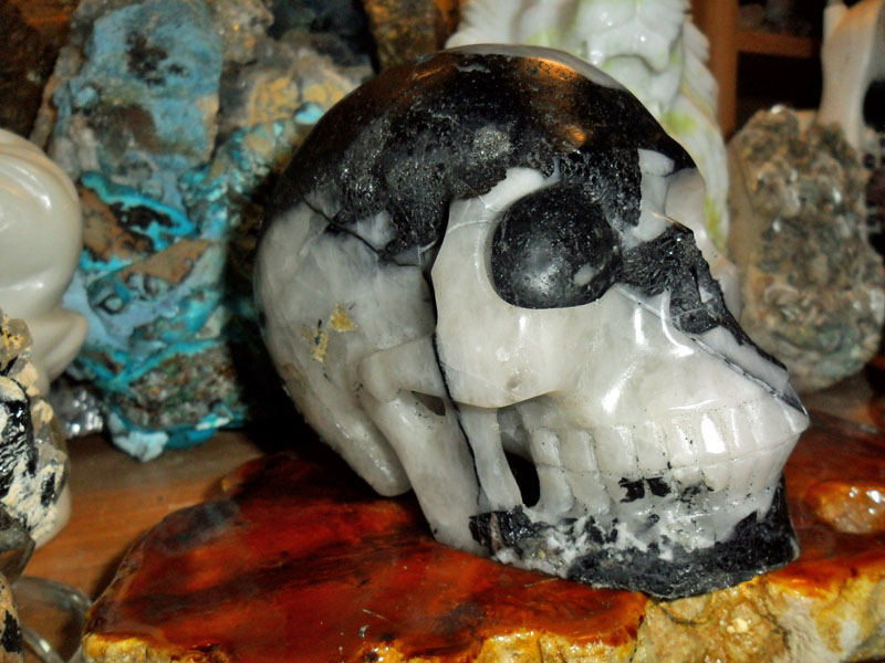 Exceptional and Beautiful 5" Black Tourmaline Carved Crystal Skull. The Black Tourmaline on Skull Carving is Some Smooth. Rough Sections thru out the Skull and All Natural. In Person Just Marvelous Piece. That’s the way the Artist made it. To ME as A Collector, Exceptional and Beautiful Skull Carving. Black Tourmaline is also a powerful grounding stone, electrical in nature, providing a connection between Earth and the Human Spirit. Its supportive energy aligns the energy centers of the body and channels healing light throughout the system. Black Tourmaline promotes a sense of power and self-confidence, allowing for a clearer, more objective view of the world. It is empowering to those who must live or work in challenging environments or when facing difficult circumstances. This Beautiful Skull been in My Collection Many Years Very Well Kept in My Gallery Cabinet Collection. This is made by Skullis from China. Pictures Show all Angles of This Beautiful Skull Carving. Measurements: 5” Wide, 3 3/4” Tall, 3” Thick. Weight Approximately: 31/2 lbs. Price: $195.00 Shipping and Handling: $25.00 In Person Exceptional and Just Simply Breath Taking for a Unique Collector.
