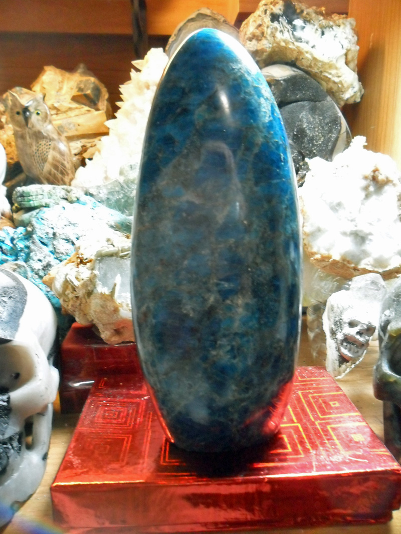 This is a Large Exceptional and Beautiful 1523.53 Grams Blue Apatite Freeform. Fully Polished Blue Apatite Crystal. Blue Apatite is a stone of manifestation attuned to the future, activating psychic abilities and allowing expansion of knowledge. Apatite will stimulate the intellect and brings ideas from the mind down into the earth realm through realizations. Blue Apatite opens the throat chakra. It enhances communication in groups and facilitates public speaking. It heals the heart and emotions. This Beautiful Piece is Very Well Kept in My Gallery Cabinet over 20 Years Measurements: 7” Tall, 3” x 3" x 3" it has 3 sides to it. Weight: 1523.53 Grams. {3.359 lbs.} Origin: Brazil. Price: $185.00 Shipping and Handling: $35.00 Worth so much More. Simply Just Breath Taking. More Pictures on Request.