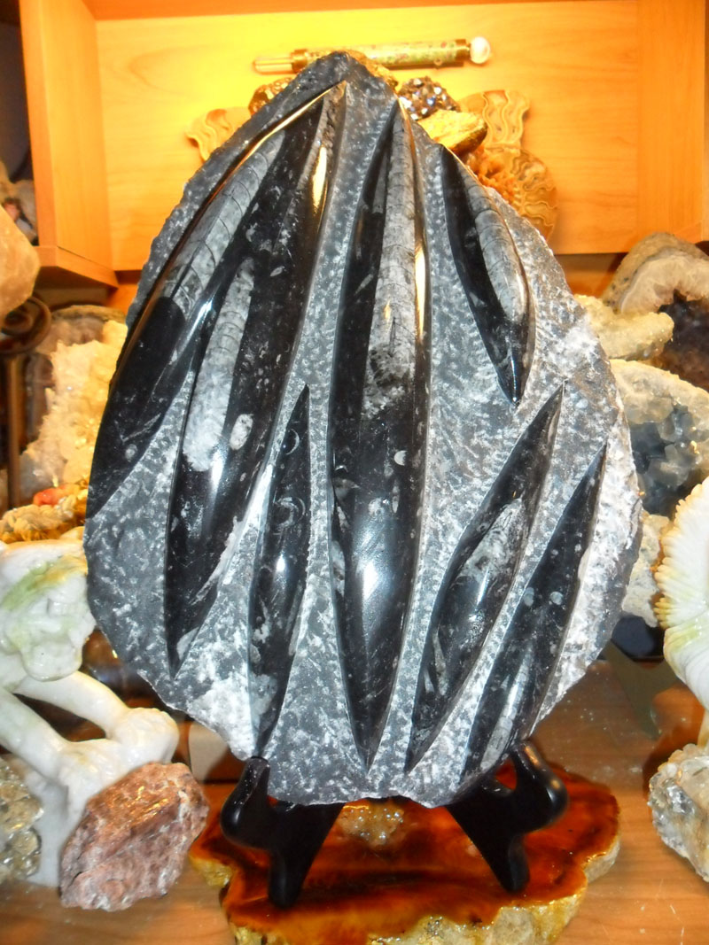 Item #197 NEW NEW Exceptional and Beautiful Huge Extinct Orthoceras Fossil Plate Display Specimen that was Unearthed in Morocco. The plate has been professionally carved and polished to reveal the black marble looking limestone to which these amazing specimens have been buried in. There are 7 Full Orthoceras on This Beautiful Display Piece. These orthoceras were a cephalopod not a gastropod which is a snail like creature. Orthoceras, also known as Orthoceratites, is a genus of extinct nautiloid cephalopod. Its name is derived from the words “straight horn”, referring to it's long, conical shell. These creatures roamed the seas during the Ordovician Period (485 million - 443 million years ago). The fossil specimen weighs in at 9 lbs. 13 ozs. Measurements: 13” Tall, 9 1/2” Wide and 2” Thick. This fossil would make a wonderful gift or a great addition to your collection. Orthoceras Crystal Healing Properties: Fossils are a wonderful tool to assist you in moving from the old to the new and to be receptive to the fresh, innovative forces that are available to you. Fossils can assist you in your quest for transition, transformation and personal growth, helping you to understand the process of change. They can help you instill quality and excellence in your environment. They are ancestors to the modern day squid. Even though they were among the earliest forms of life, this class of nautiloid is still considered to be one of the most intelligent forms of ocean life. The Orthoceras ranged in size from a few inches in length to over six feet. They could swim as well as crawl on the ocean floor. By filling the chambers in their shells with air they could float through the seas propelling themselves by squirting jets of water. As they died their shells accumulated upon the ocean floor, then covered by sediments they transformed into stone over the ages. Having a long straight shell their fossils have an iridescent gem like quality when polished. Orthoceras are commonly found in the Atlas Mountains of Morocco. This Specimen is in Exceptional Condition and Very Well Kept in My Gallery Cabinet. Exceptional and Perefect with Perfection and AAA++ Price: $195.00 Shipping and Handling $35.00 Pictures Show All Angles of This Huge Exceptional and Beautiful Extinct Orthoceras Plate Display Specimen that was Unearthed in Morocco. You Won't Find Anything Like This Online Exceptional Piece. Exceptional and Just Breath Taking Specimen. Exceptional and Simply Breath Taking. More pictures on Request.